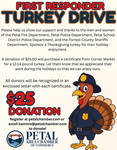 The Petal Area Chamber of Commerce is proud to host a Turkey Drive to give back to the incredible men and women who serve and protect our community every day. From now through November 7th, we’re collecting donations to provide Thanksgiving turkeys for our local first responders — including our police officers, firefighters, EMTs, and other emergency personnel.